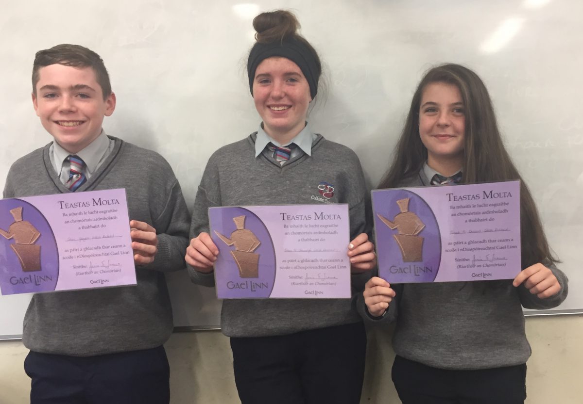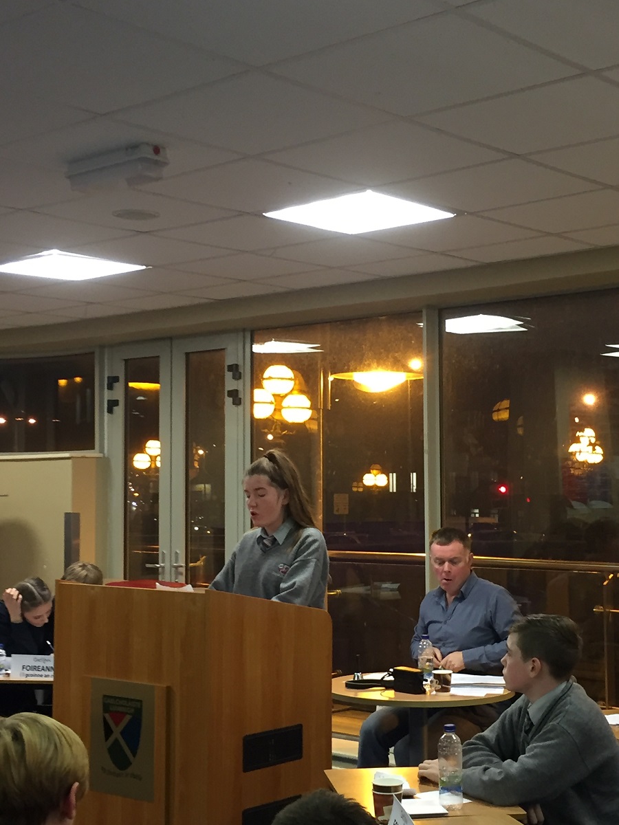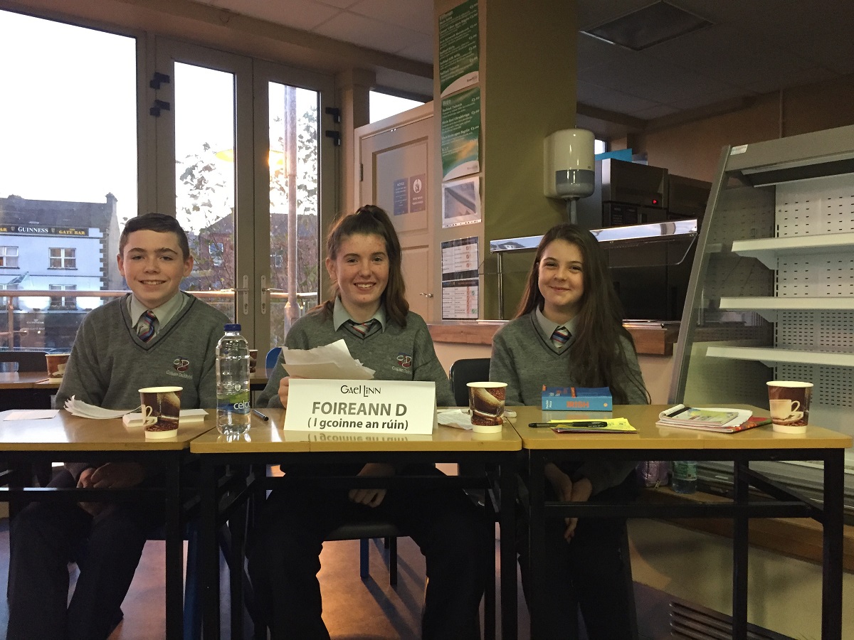 Maith sibh bliain a haon agus na fóirne díospóireachta! Ghlac triúr ón gcéad bhliain agus triúr ón tsraith shinsearach páirt i gcomórtas na nGaelcholáistí eagraithe ag Gael Linn. Bhí an díospóireacht ar siúl i gcathair Luimní i gcoinne Gaelcholáiste Luimnigh, Scoil Chuimsitheach Chiaráin, An Cheathrú Rua, Co. na Gaillimhe agus Coláiste Chroí Mhuire, An Spidéal, Co. na Gaillimhe. Bhí dúshlán mór roimh ár ndaltaí dul i ngleic le cainteoirí dúchais Chonmara. Bhí Cian, Jessica agus Niamh ón gcéad bhliain in iomaíocht le daltaí ón tríú bliain agus thug siad an-dúshlán don fhreasúra. Bhí bliain a haon ar fad ann chun tacaíocht a thabhairt dá gcairde agus éisteacht leis an dhá uair an chloig d’argóintí agus bhíomar an-bhródúil as a gcuid iompar agus béasaí. Bhí Cian, Jessica agus Niamh chomh maith sin go bhfuilimid ag súil le rudaí iontacha sa todhchaí! Fuair na daltaí teastais mar aitheantas dá gcuid iarrachtaí. Ghlac an fhoireann shinsearach páirt ann sa chomórtas freisin le rún deacair acu – gur cheart deireadh a chur le cuntas Twitter Donald Trump! Bhí dian-iomaíocht ann idir na fóirne sinsearacha freisin ó na scoileanna céanna agus bhí mí-ádh orthu gan dul ar aghaidh go dtí an chéad bhabhta eile.