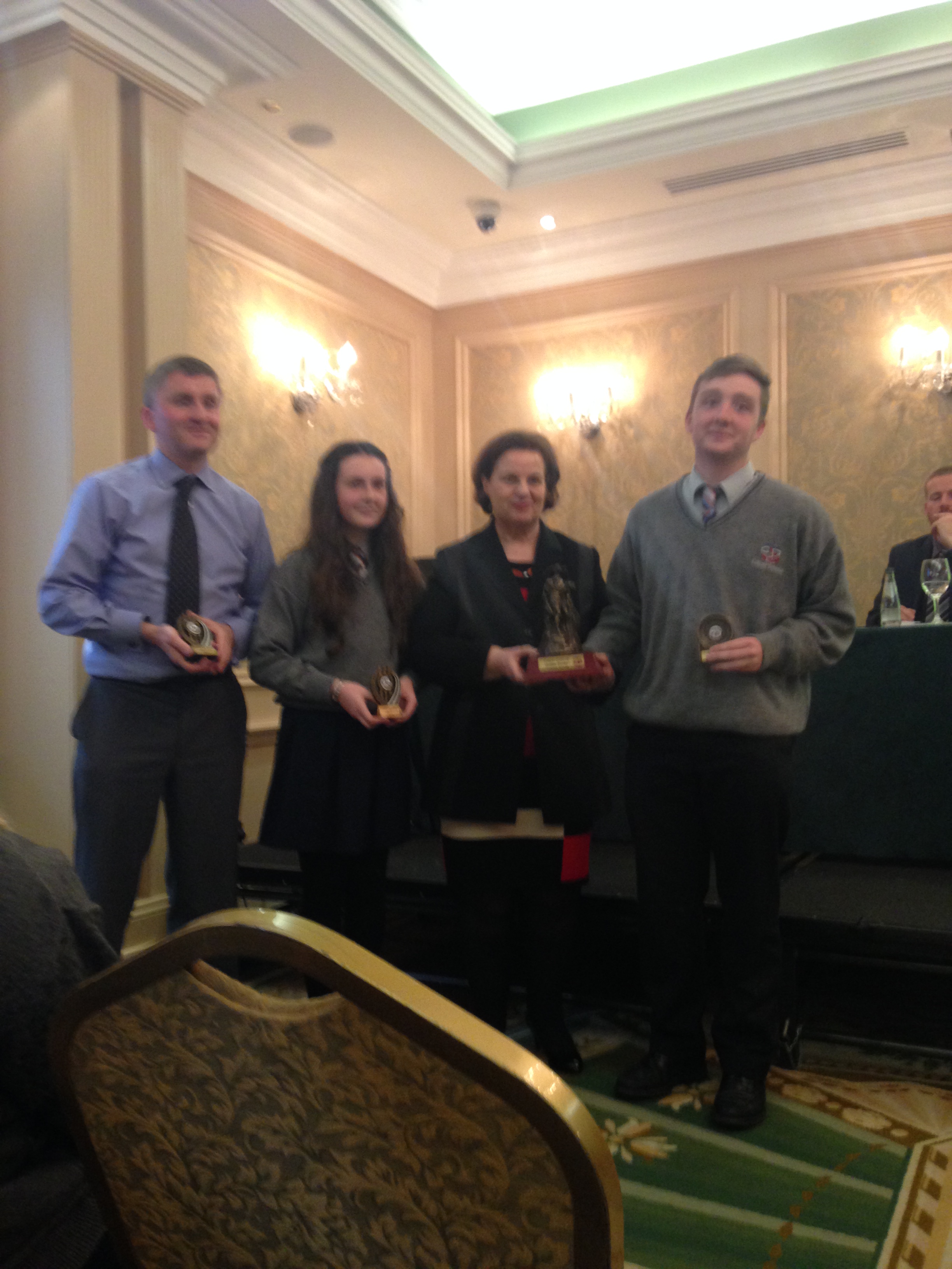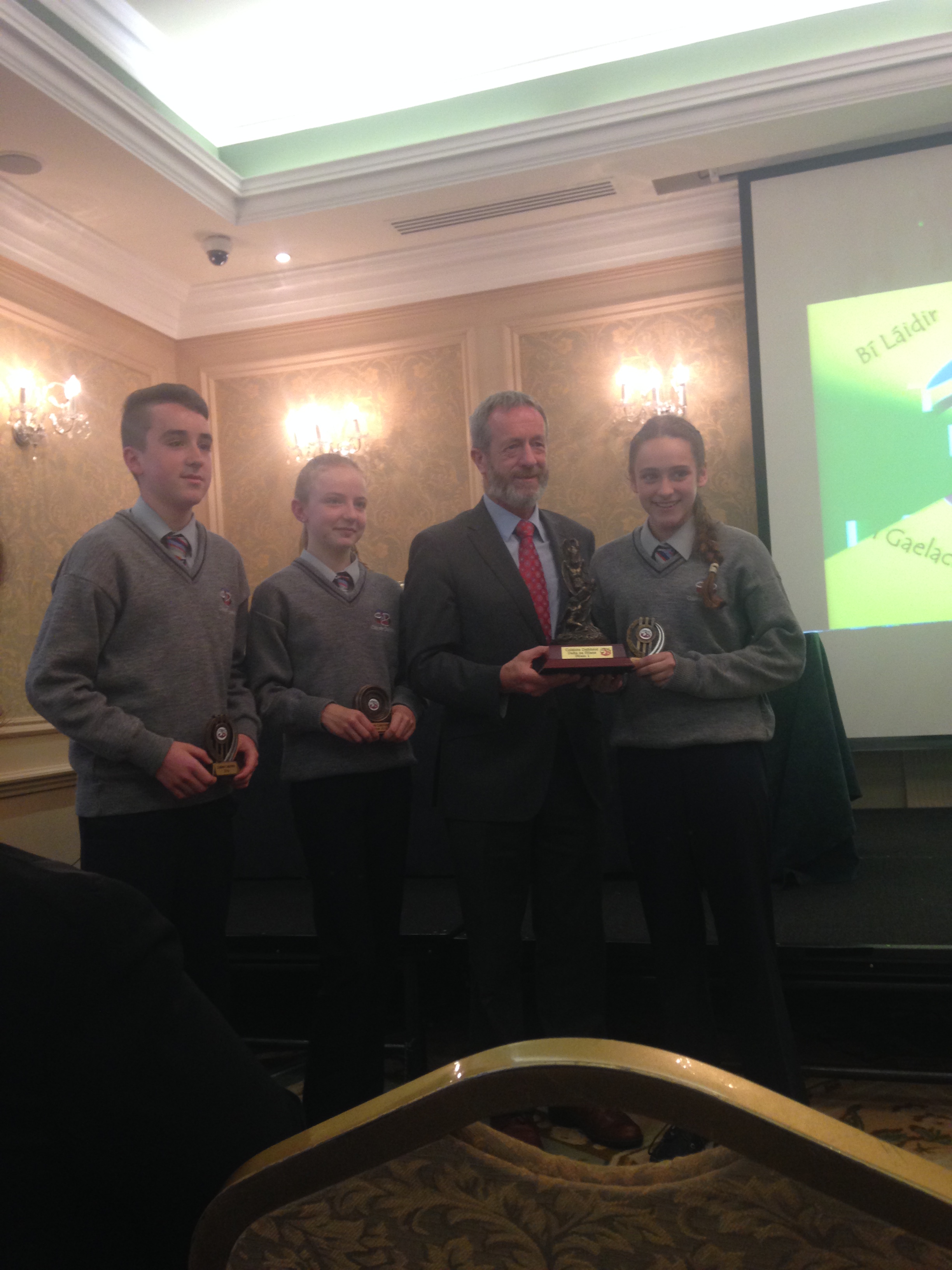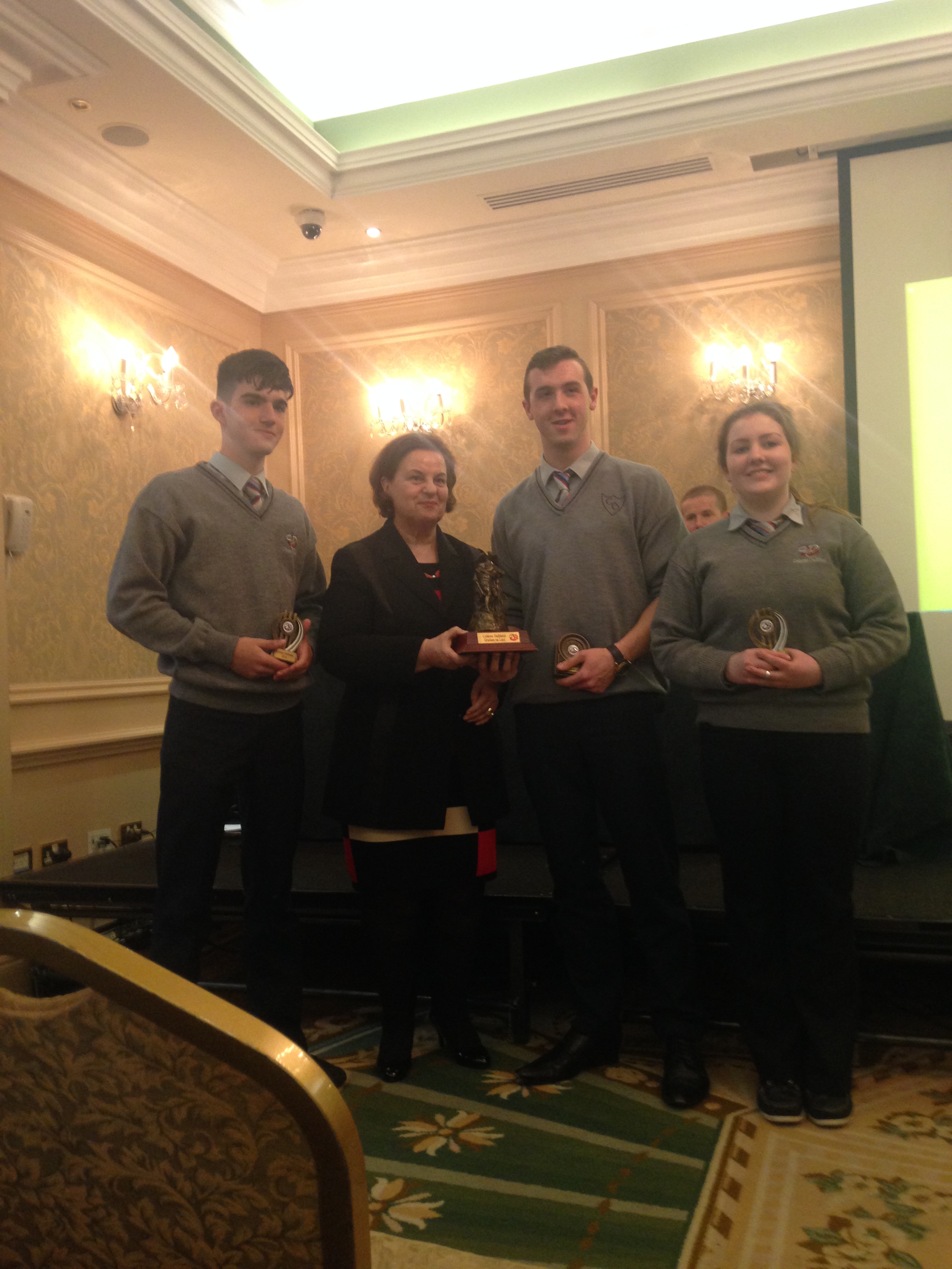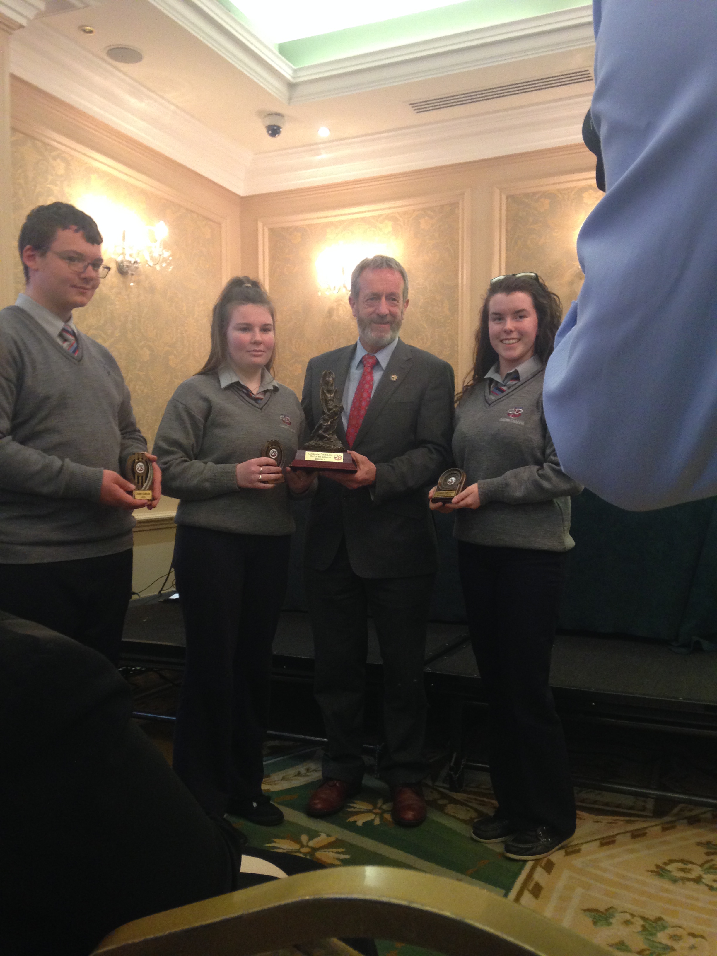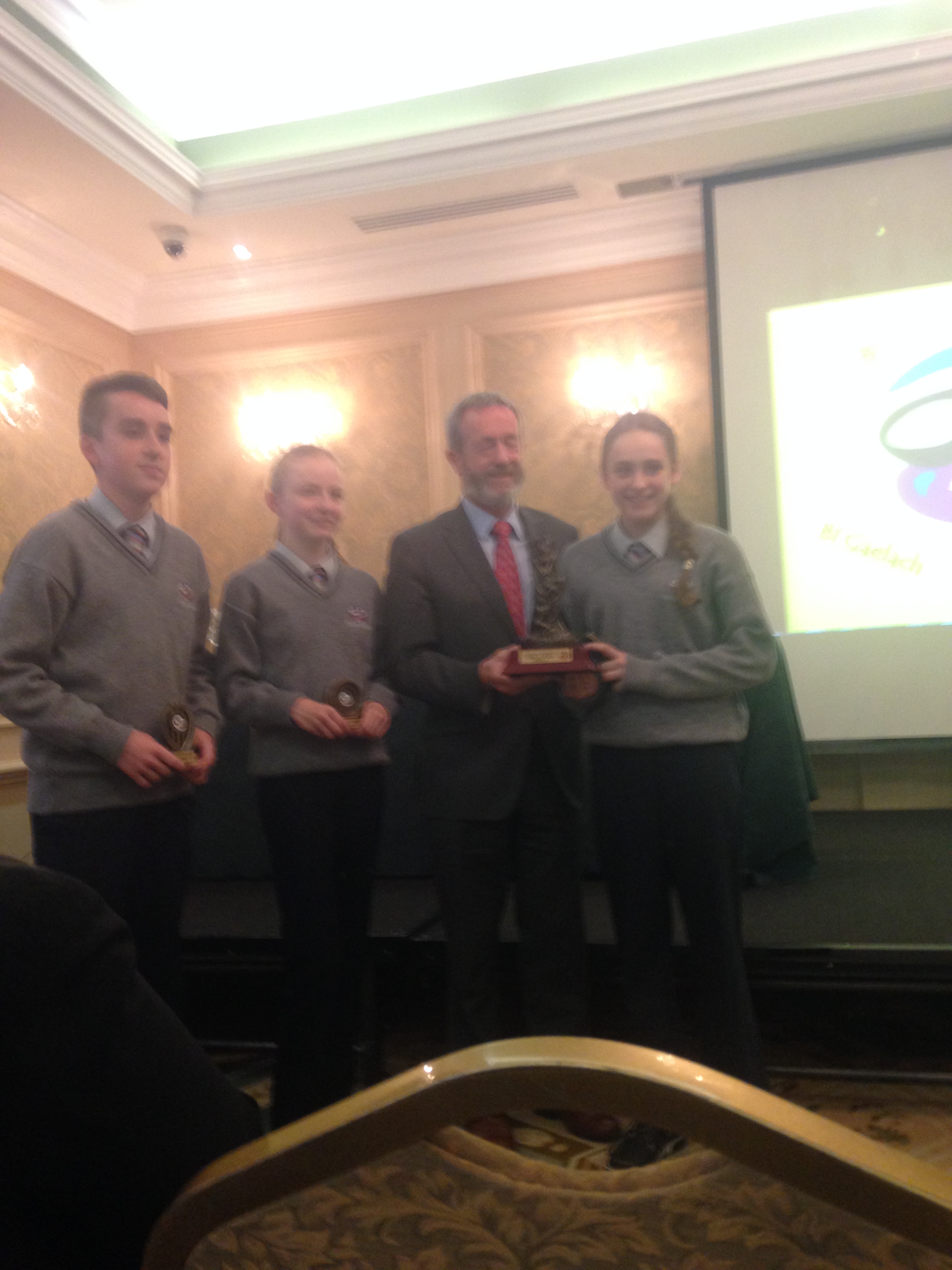 We had a very enjoyable whole-school occasion on May 17th. Our Annual School Awards, Gradaim na Scoile, were presented in the Imperial Hotel, Cork. All students and teachers attended, as well as some parents. We were delighted to have our special guest in attendance, Mr. Seán Kelly, Member of the European Parliament and Past President of the GAA. Máire Bn. Uí Bhriain, Chairperson of the Board of Management, was also with us. She presented a new award, Gradam Uí Bhriain, ‘An Tine Bheo’, to the student who most embodied the student spirit of Coláiste Daibhéid this year, Ewan Mac Conchra (6th Year). School Principal, Tadhg Ó Laighin, this year presented Gradam Daibhéid, The Principal’s Award, to Michaela de hÍde (6th Year). Deputy Principal, Pól Ó Síodhcháin, created a short film of the year’s highlights especially for the occasion. Our school musicians performed a nice mixture of songs under the direction of Iníon Uí Bhreacáin. A YouTube clip of their performance of Óró ‘Sé Do Bheatha Bhaile’ is below aswell as a list of the awards recipients and some photos: