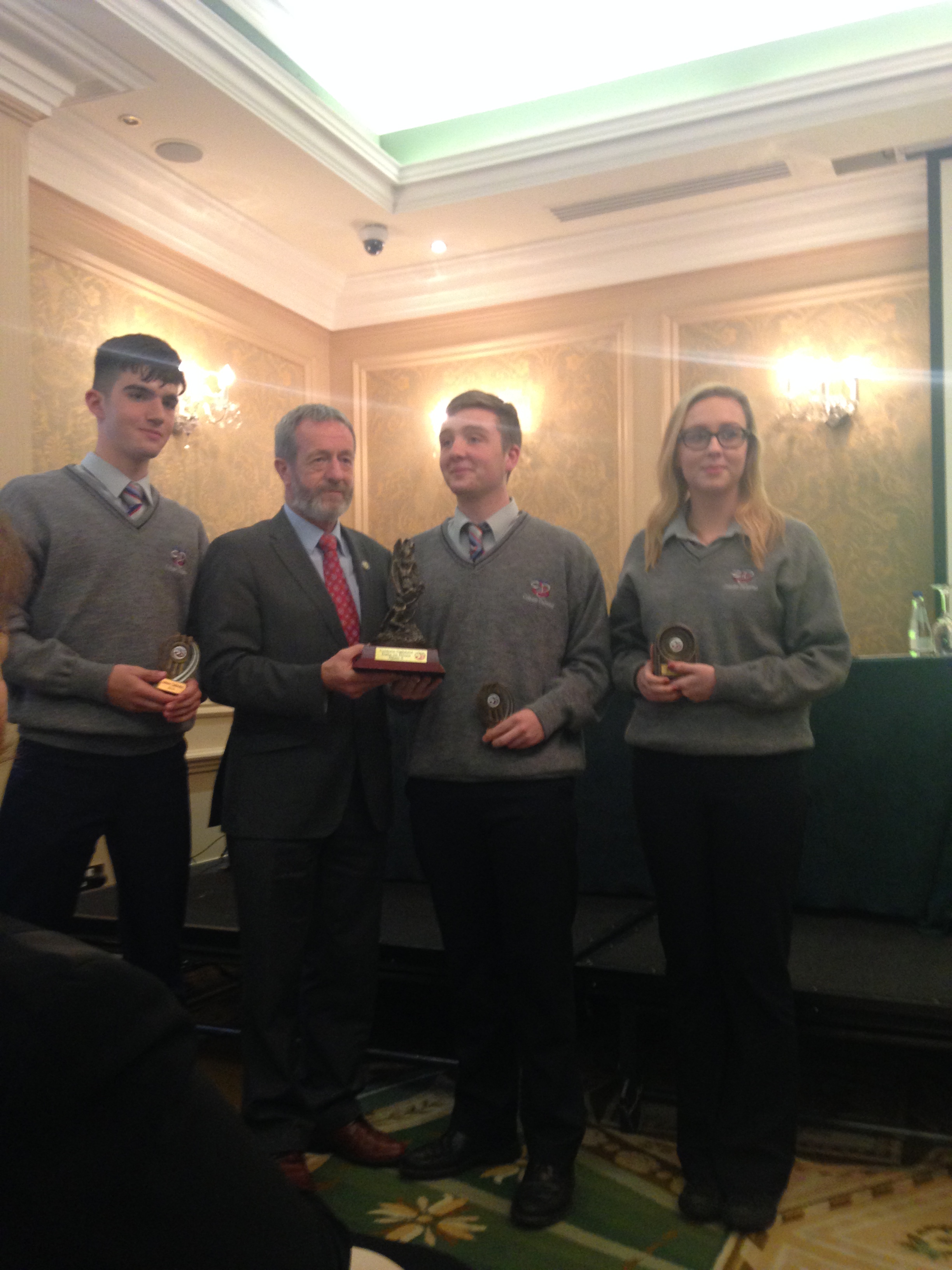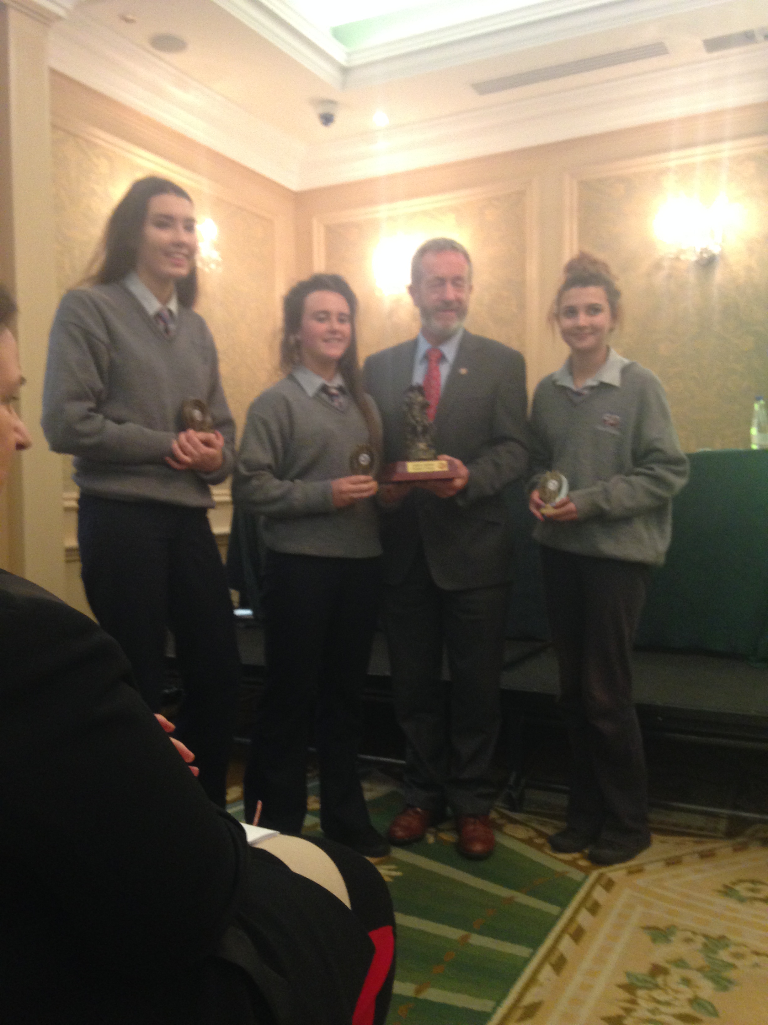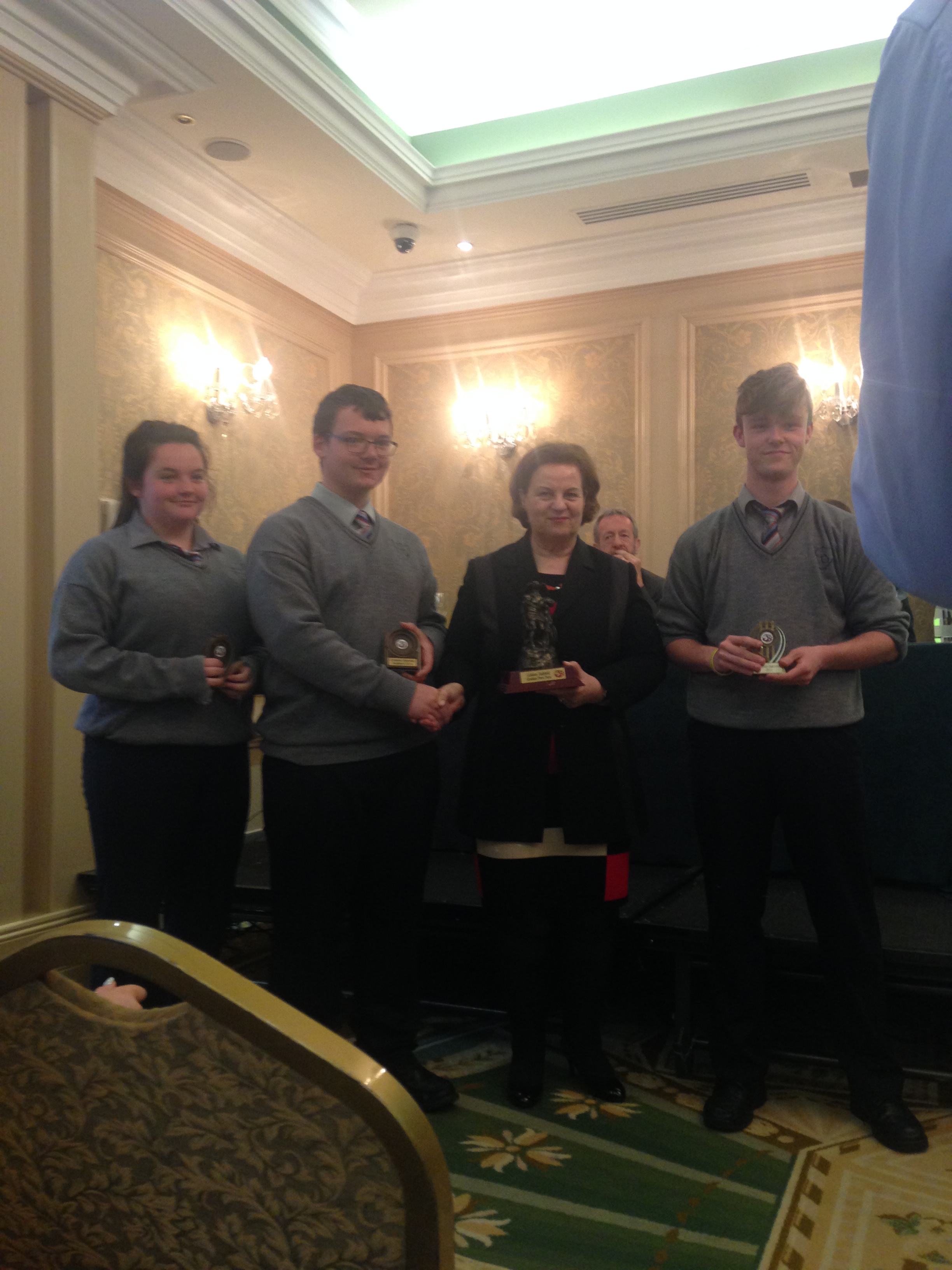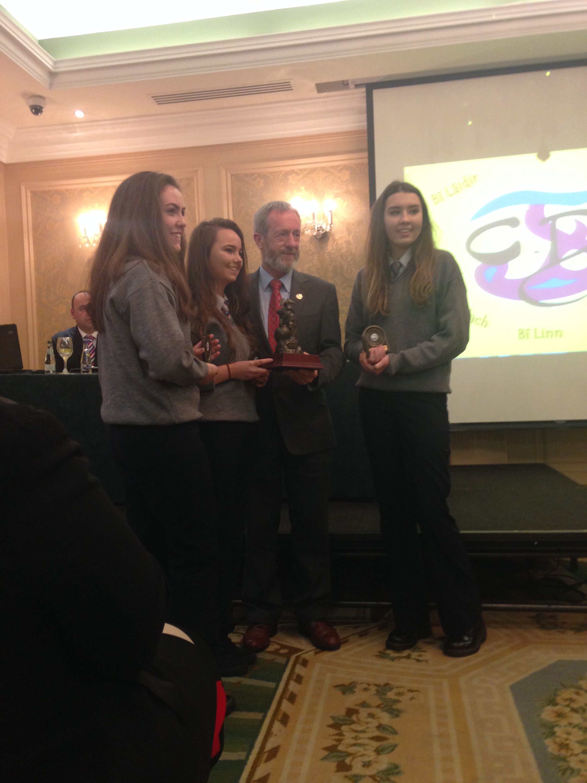 We had a very enjoyable whole-school occasion on May 17th. Our Annual School Awards, Gradaim na Scoile, were presented in the Imperial Hotel, Cork. All students and teachers attended, as well as some parents. We were delighted to have our special guest in attendance, Mr. Seán Kelly, Member of the European Parliament and Past President of the GAA. Máire Bn. Uí Bhriain, Chairperson of the Board of Management, was also with us. She presented a new award, Gradam Uí Bhriain, ‘An Tine Bheo’, to the student who most embodied the student spirit of Coláiste Daibhéid this year, Ewan Mac Conchra (6th Year). School Principal, Tadhg Ó Laighin, this year presented Gradam Daibhéid, The Principal’s Award, to Michaela de hÍde (6th Year). Deputy Principal, Pól Ó Síodhcháin, created a short film of the year’s highlights especially for the occasion. Our school musicians performed a nice mixture of songs under the direction of Iníon Uí Bhreacáin. A YouTube clip of their performance of Óró ‘Sé Do Bheatha Bhaile’ is below aswell as a list of the awards recipients and some photos: