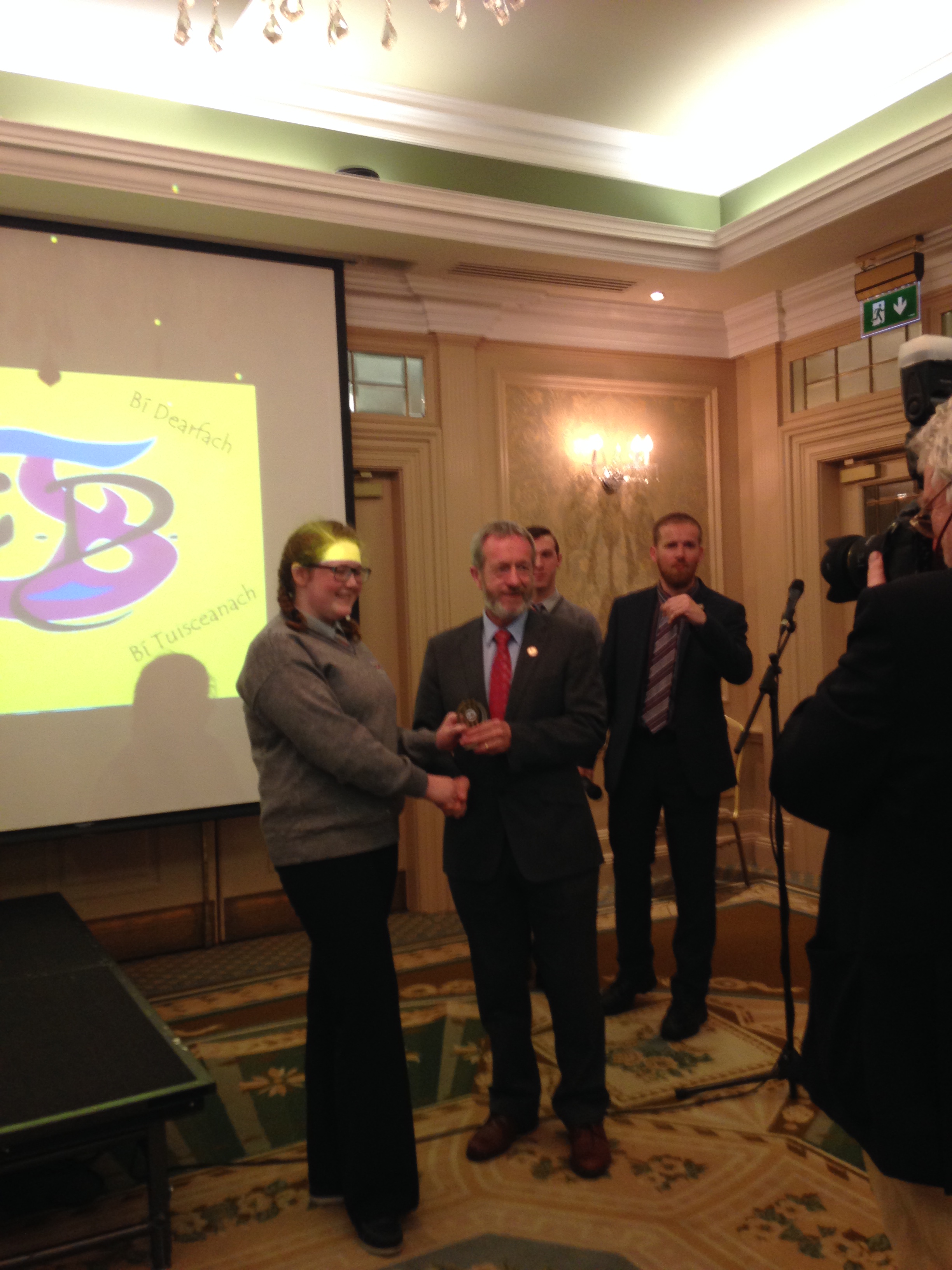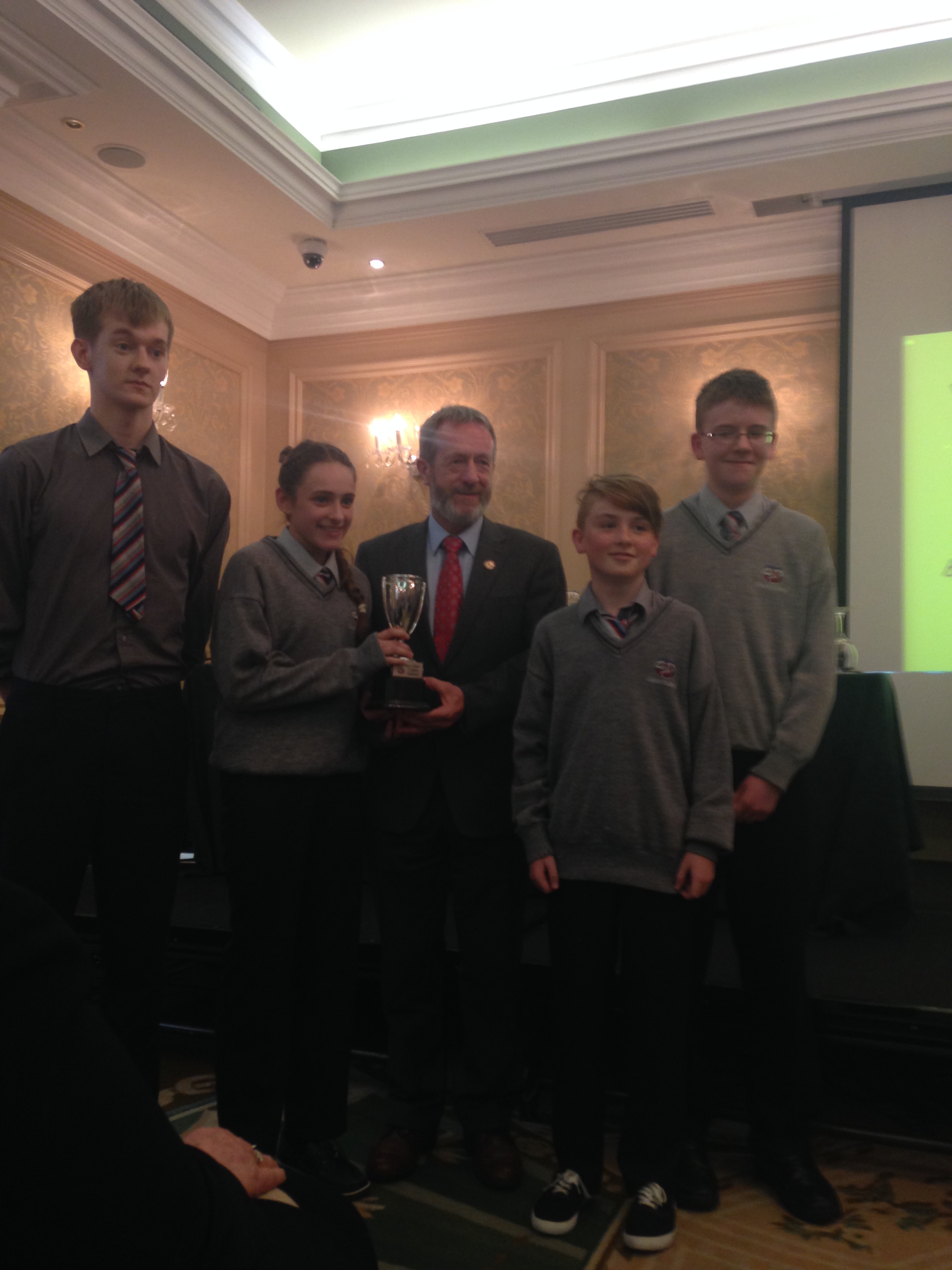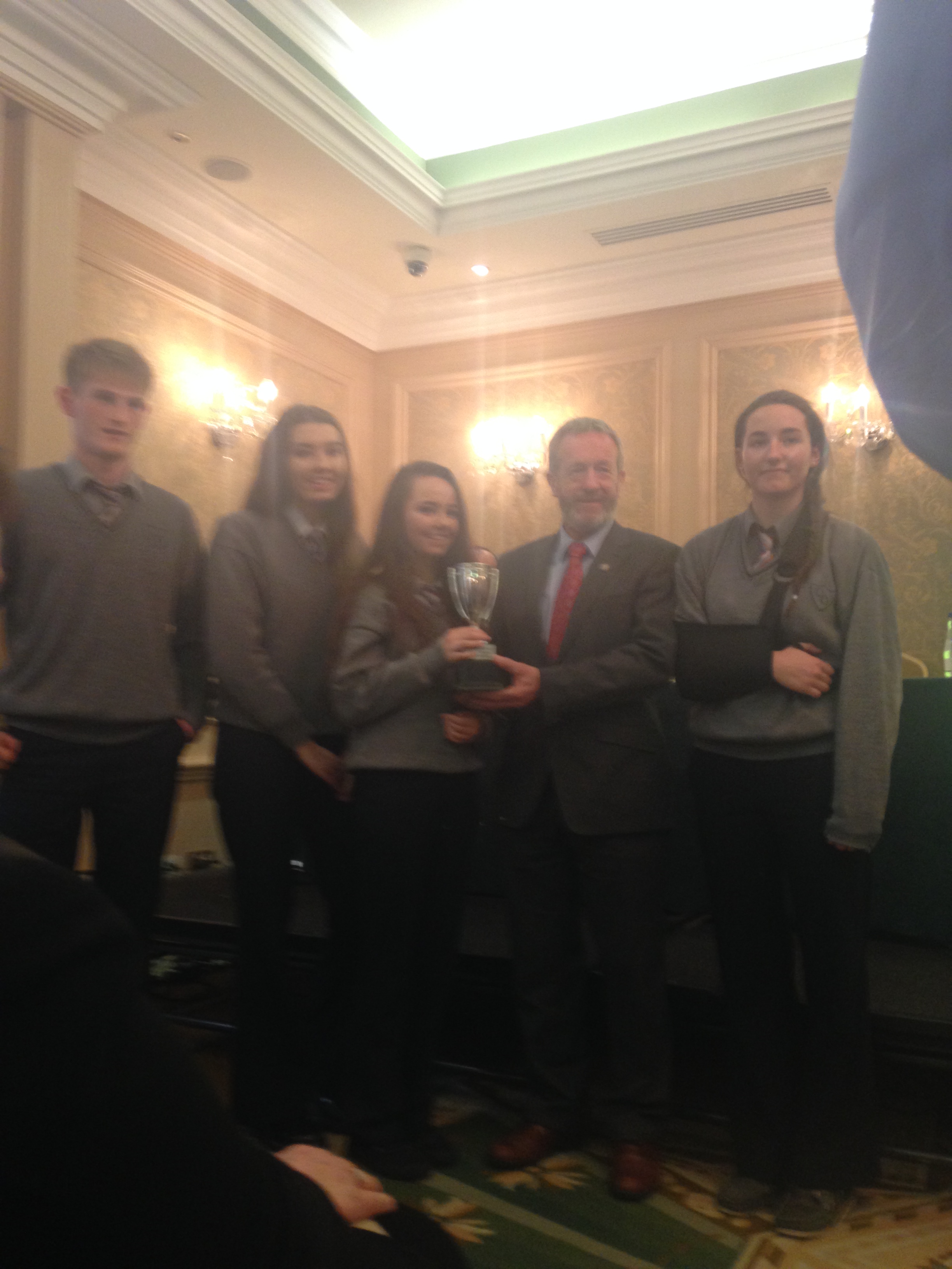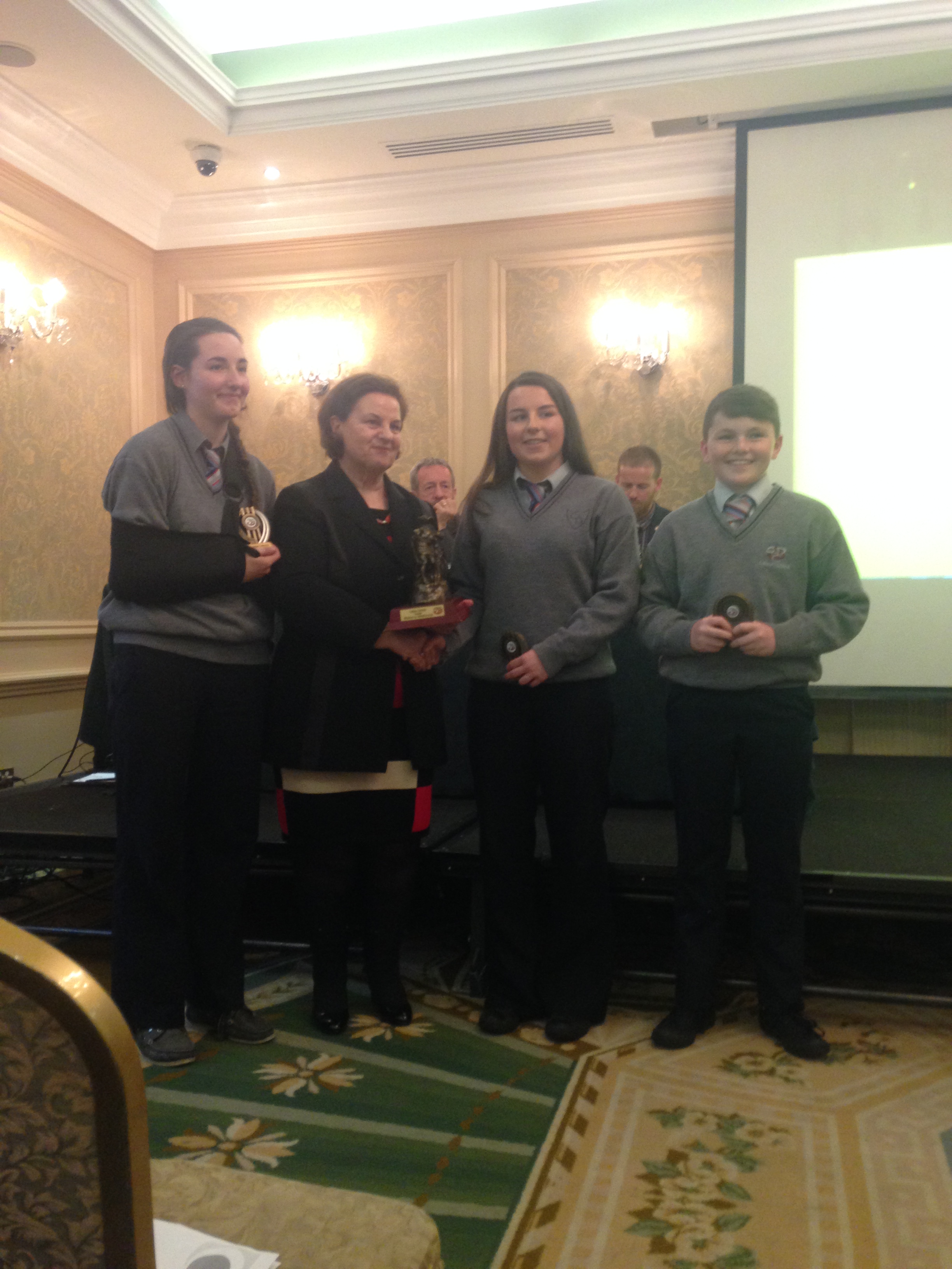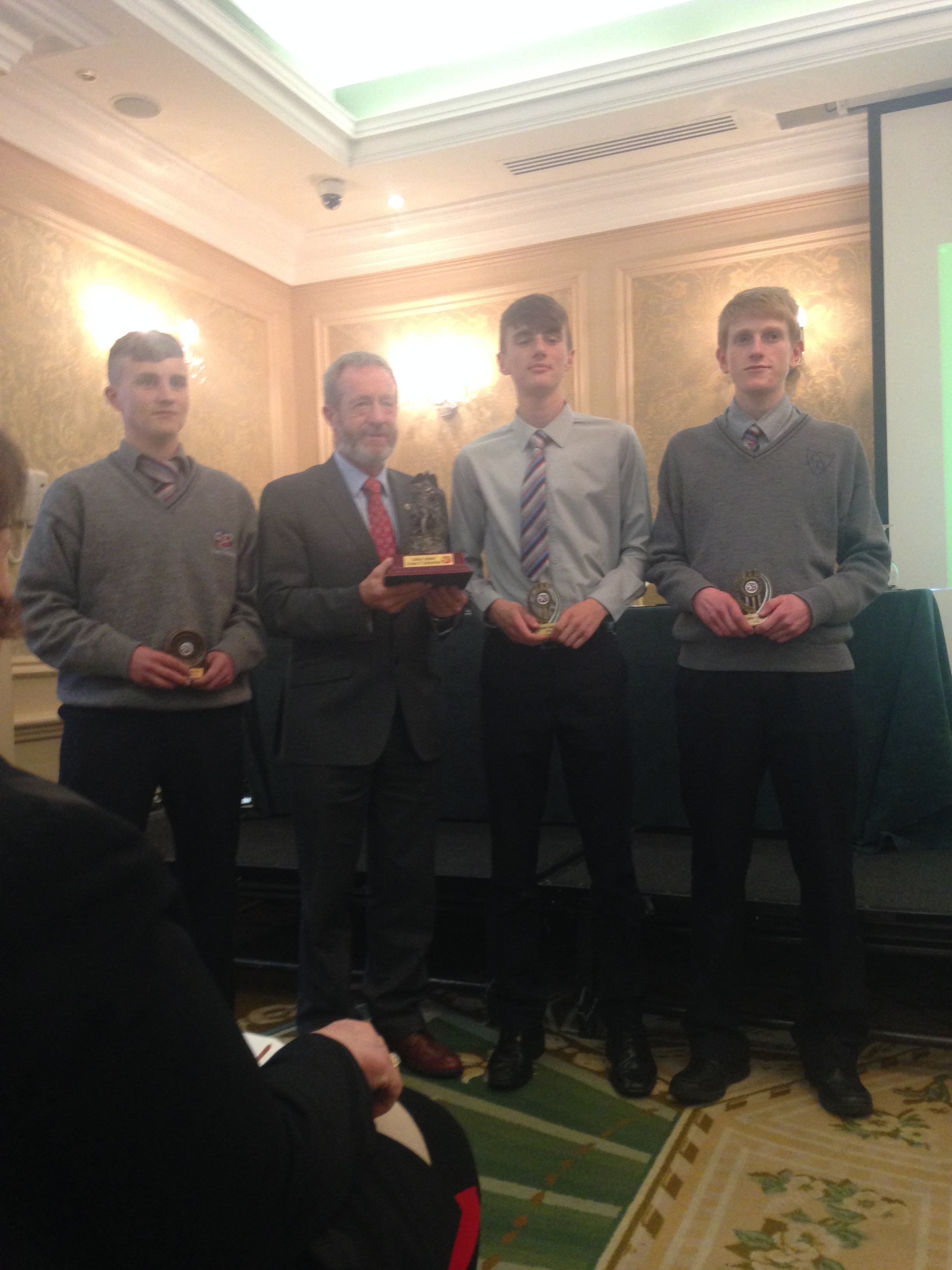 We had a very enjoyable whole-school occasion on May 17th. Our Annual School Awards, Gradaim na Scoile, were presented in the Imperial Hotel, Cork. All students and teachers attended, as well as some parents. We were delighted to have our special guest in attendance, Mr. Seán Kelly, Member of the European Parliament and Past President of the GAA. Máire Bn. Uí Bhriain, Chairperson of the Board of Management, was also with us. She presented a new award, Gradam Uí Bhriain, ‘An Tine Bheo’, to the student who most embodied the student spirit of Coláiste Daibhéid this year, Ewan Mac Conchra (6th Year). School Principal, Tadhg Ó Laighin, this year presented Gradam Daibhéid, The Principal’s Award, to Michaela de hÍde (6th Year). Deputy Principal, Pól Ó Síodhcháin, created a short film of the year’s highlights especially for the occasion. Our school musicians performed a nice mixture of songs under the direction of Iníon Uí Bhreacáin. A YouTube clip of their performance of Óró ‘Sé Do Bheatha Bhaile’ is below aswell as a list of the awards recipients and some photos: