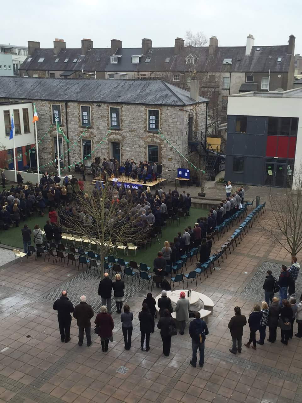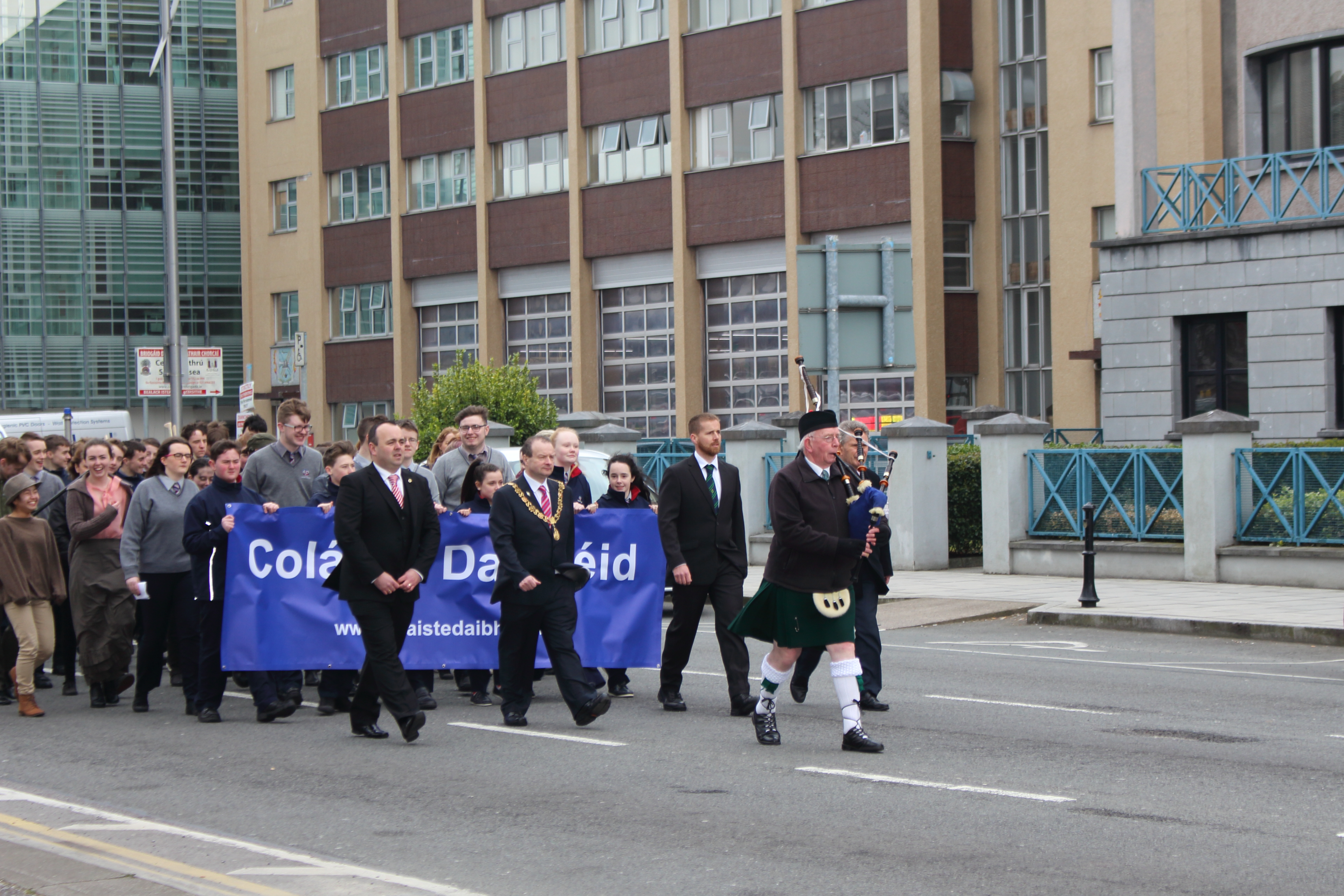 We paraded back to the school through the streets of Cork behind a Piper, the National Flag, the Flag of the Irish Republic and the School Flag. Those flags were then raised at the school by Diarmuid Ó Luasa, the first Principal of Coláiste Daibhéid, Ted Owens and Michaela de hÍde (on behalf of the Student Council). We had a number of inspiring speeches on the day in honour of the occasion that was: School Principal, Tadhg Ó Laighin; Chairperson of the Board of Management, Máire Bn. Uí Bhriain; Ted Owens and School Deputy Principal, Pól Ó Síodhcháin.